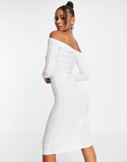 Bardot Ruched Midi Dress White Luxe Midi Dresses And Celebrity Inspired Dresses